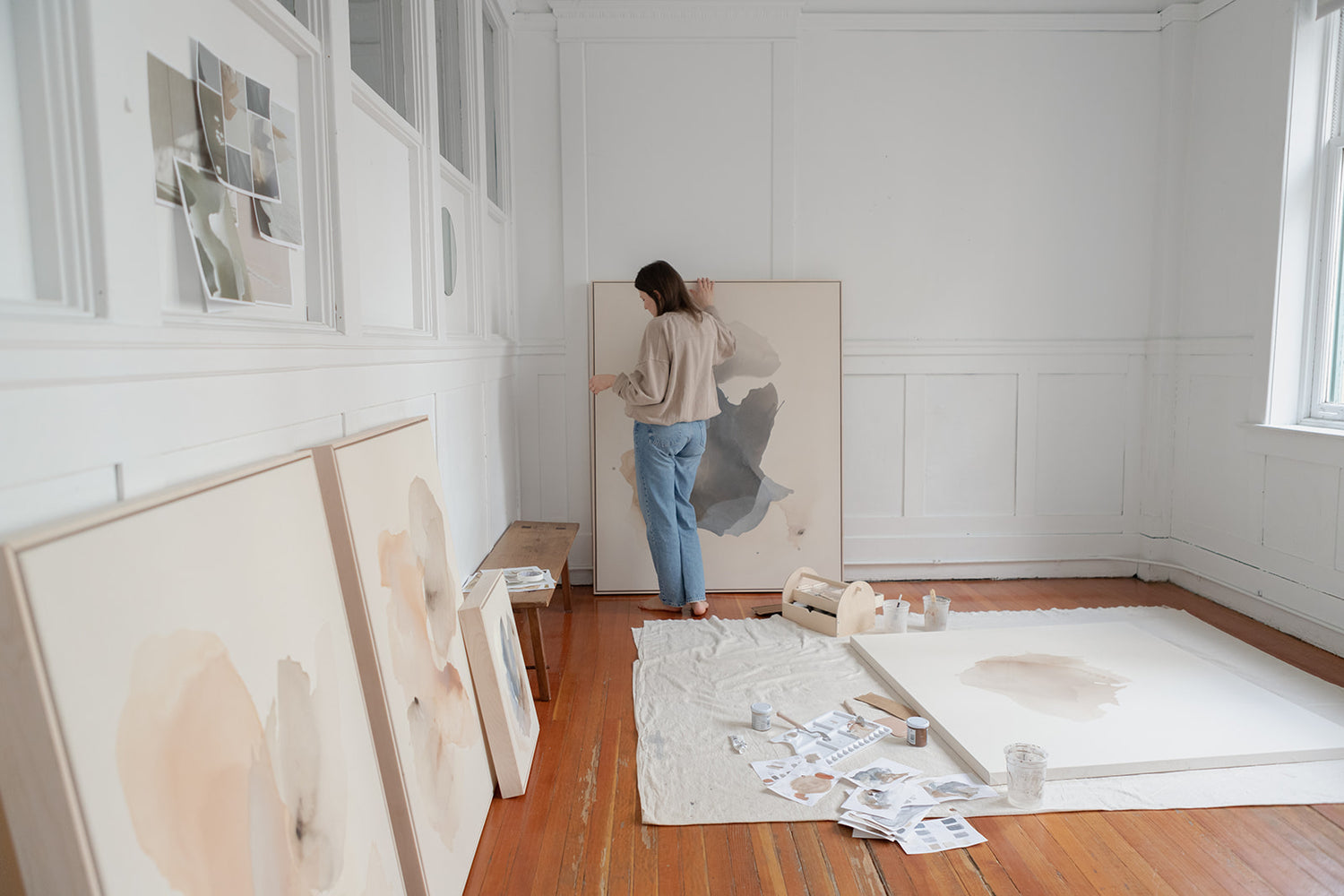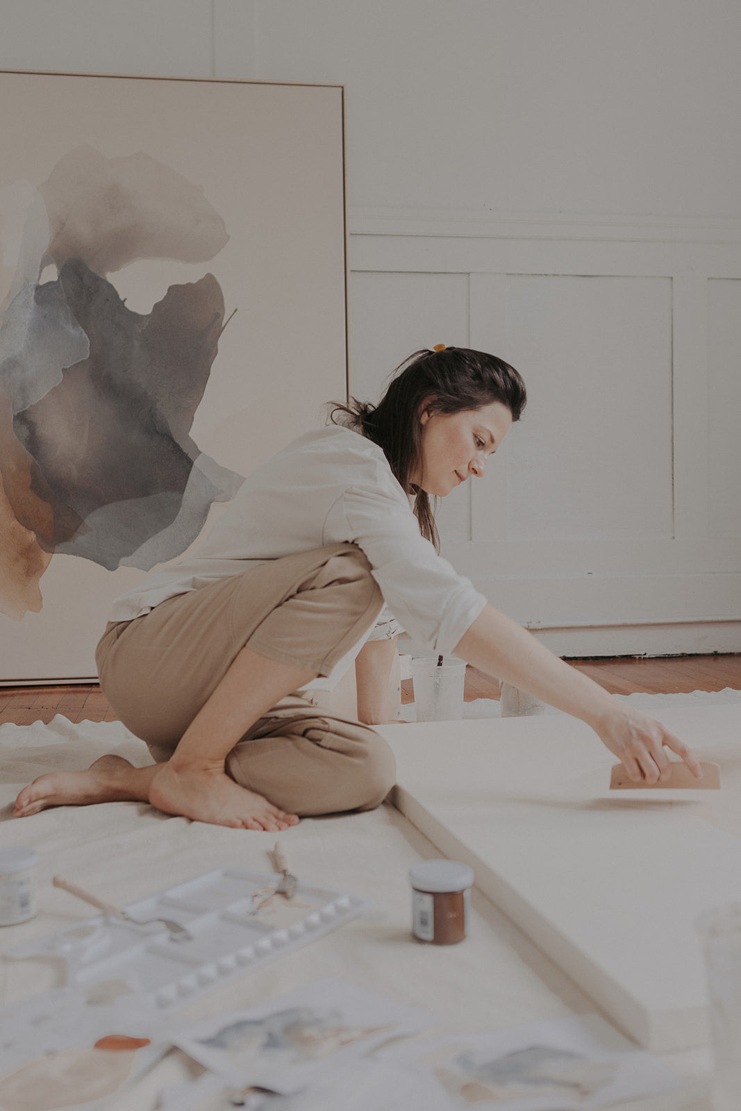 Her work explores an intuitive approach to painting, drawing from beauty in nature and her visual experience. Employing a neutral, matte color palette, her work is characterized by the pouring and manipulation of pigment and water on canvas in a conversational process that builds. The play of light, movement and textures in nature is echoed by the shapes, pigments and layers. She seeks balance through this chance form of expression that emerges into beautiful abstract pieces of art.